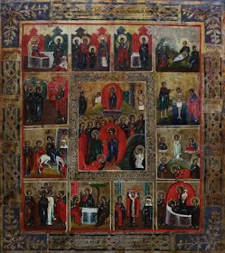 Сейчас я знаю, как эта икона называлась и какие надписи были под картинками. Это "Воскресение Христово и двенадцать праздников". Под каждой картинкой, сюжетом на Евангельские темы, надпись 12 основных праздников: